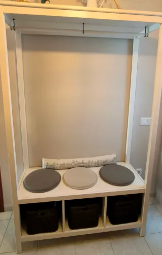 Mueble recibidor con diseño moderno y funcional. - Estructura principal en madera. - Cojines circulares para asiento. - Cestas de almacenaje incluidas.