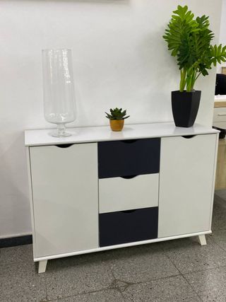 Aparador moderno con dos puertas y tres cajones centrales, combinando acabados en blanco y gris. HACEMOS ENVÍOS +INFO LLAMA O ESCRIBENOS +34 600**473**941 ✅Producto nuevo ✅Paga en casa