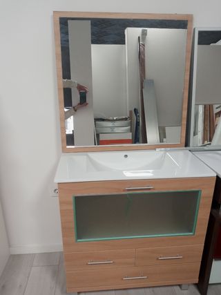 conjunto de mueble de baño Nuevo, compuesto por mueble de baño, lavabo y espejo con marco trasero de madera.Una vitrina de cristal abatible y tres cajones. medidas 80 ancho×46 fondo x85 alto cm