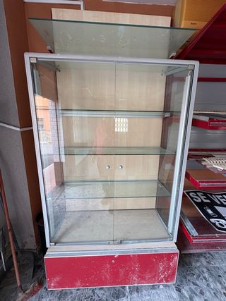 2 Vitrinas expositora con estructura de metal y puertas de cristal. - Estantes de cristal. - Base roja. - Diseño moderno y funcional. Hace falta una limpieza, de hay su precio Medidas 2,35 altox 0,50 fondo x 1,02 ancho Precio de la unidad, 80€ las 2