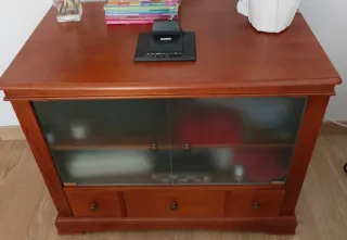 Elegante vitrina de madera maciza, perfecta para exhibir tus objetos decorativos o vajilla. Ademas, tiene la zona de TV con puertas correderas y soporte extraible - Diseño clásico con puertas de cristal y madrra - Amplio espacio de almacenamiento (cajones, baldas y vitrinas) - Madera natural - En perfecto estado