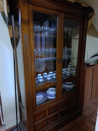 Mueble de madera con varias vitrinas y cajones. - Estructura principal de madera. - Puertas de vitrina con cristal. - Múltiples compartimentos de almacenamiento. Escucho ofertas. Hay que venir a por él y desmontar. Gracias
