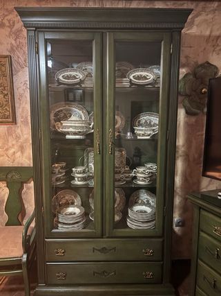 Vendo conjunto completo de mobiliario de salón en excelente estado, ideal para amantes del estilo clásico, y rústico. El pack incluye: - Aparador Vitrina: Mueble blanco de gran capacidad con puertas de cristal (se vende vacío, sin adornos). - Mesa de Comedor: Incluye el cristal protector y el paño de base hecho a medida. - 4 Sillas: Estructura robusta y tapicería floral impecable. - Cortinas: Juego completo con galería decorativa superior a juego con las sillas.