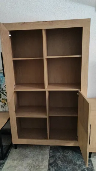 Mueble de salón, estantería y vitrina, además añadimos de regalo un espejo de 180x60cm en color roble cambrian en perfecto estado. 2 años de uso. No se envía, hay que venir a por él.