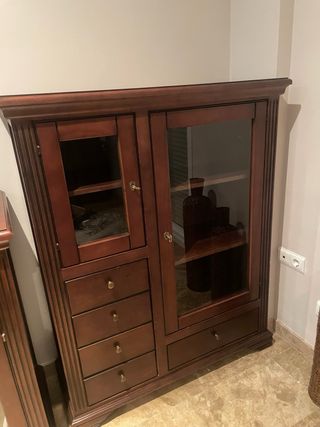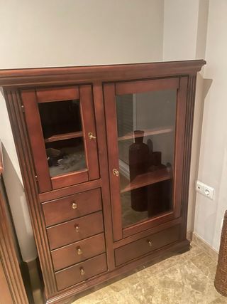 Elegante vitrina de madera maciza con puertas de cristal para exhibir tus objetos. - Diseño de dos puertas con tiradores. - Estantes interiores para organizar. - Base inferior con cajones. TENGO A JUEGO UNA MESA Y SILLAS, O OTROS MUEBLES APARADOR POR SI QUIERES COMBINAR (pregunta condiciones)
