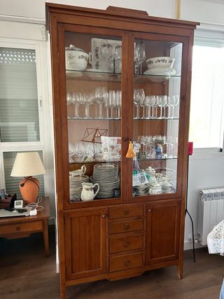 Preciosa vitrina de madera oscura, ideal para decorar cualquier espacio del hogar. Se encuentra en muy buen estado. - Dispone de puertas de cristal. - Incluye dos cajones en la parte inferior. - Perfecta para exhibir objetos decorativos o vajilla.