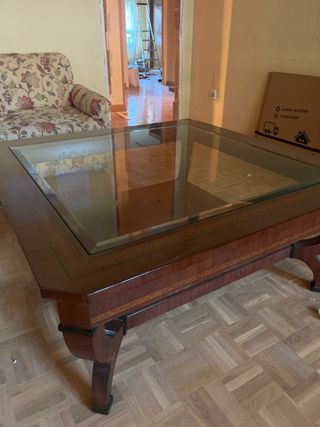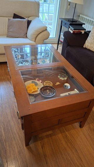 Se vende elegante y robusta mesa de centro de salón, de alta calidad, en excelente estado. ✨ Características Destacadas -Madera de Alta Calidad: madera maciza con un acabado en un tono marrón cálido (tipo nogal o caoba claro). -Tapa de Cristal / Vitrina: Superficie doble de cristal perfecta para exponer colecciones o recuerdos de forma segura. -Gran Capacidad: 2 cajones funcionales con tiradores de metal y 1 estante inferior abierto para revistas, libros o lo que necesites. Medidas 120 cm (Largo) x 70cm (Ancho) x 50 cm (Alto). Sólo recogida en Majadahonda