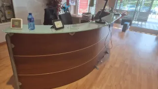 Mostrador de recepción con un diseño curvo y elegante. - Superficie principal de cristal. - Base y estructura de madera. - Combina colores marrón y transparente.