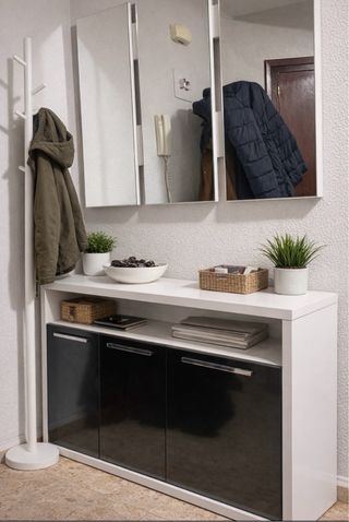 Conjunto de recibidor con espejo mas Perchero de pie con varios ganchos. Conjunto de mueble para recibidor con espejo. Se vende mueble de recibidor con armario de tres puertas y conjunto de espejos. Es moderno, práctico y perfecto para entradas o pasillos. ✔️ Características: Armario inferior con tres puertas y espacio de almacenaje. Conjunto de tres espejos verticales. Color: blanco y negro. Estado: muy bueno, con uso normal. 📏 Medidas: Mueble inferior: Largo: 99,5 cm Ancho: 28 cm Alto: 73 cm Espejo: Largo (alto vertical): 98 cm Alto (ancho horizontal): 85 cm Grosor: 3 cm