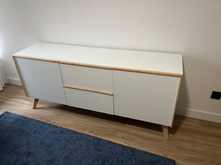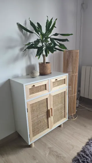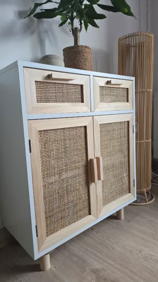 Recien montado. Es demasiado pequeno. Sin uso. Se entrega montado y así te ahorras el montaje.Mueble de diseño con estructura de madera y detalles en ratán. - Acabado en blanco y beige. - Patas de madera. - Dos cajones superiores. - Dos puertas inferiores.
