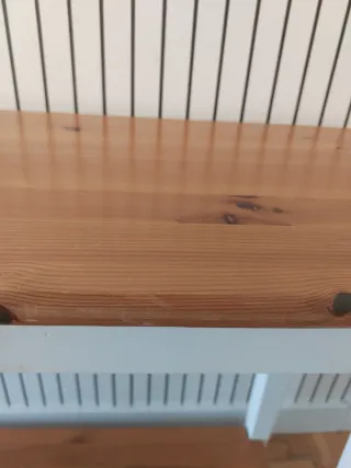 Mueble consola o aparador vintage de Ikea. Combina un tablero de madera en tono natural con patas y estructura blanca. - Diseño de dos niveles con balda inferior. - Madera de pino macizo. Colección vintage Ikea