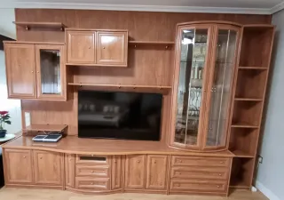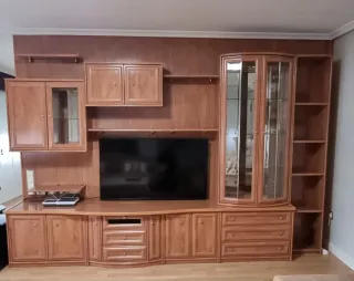 Mueble de salón modular de madera con gran capacidad de almacenaje. Ideal para organizar tu espacio. - Mueble de TV con cajones y puertas. - Vitrina con puertas de cristal. - Estanterías. - Acabado en madera. URGE VENTA EN LA SEMANA DEL 19 AL 25