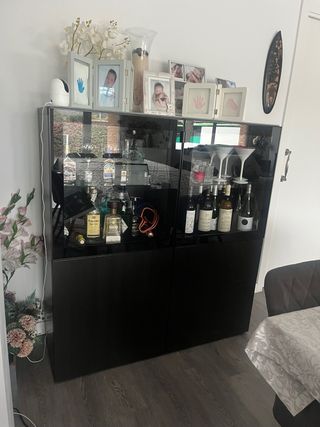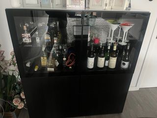 Mueble de salón de Ikea con un diseño moderno y elegante. - Combinación de cristal y madera. - Acabado en negro y transparente. Combinado cajon y puerta