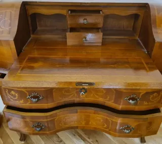 Elegante mueble secreter con un diseño clásico y detalles de marquetería. - Tres cajones amplios. - Acabado en madera con incrustaciones doradas. - Patas curvas de estilo.