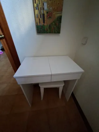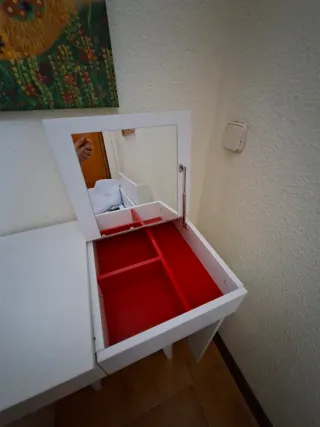 Tocador de IKEA con un diseño moderno y funcional. - Acabado en blanco. - Espejo abatible. - Compartimentos interiores para organización.