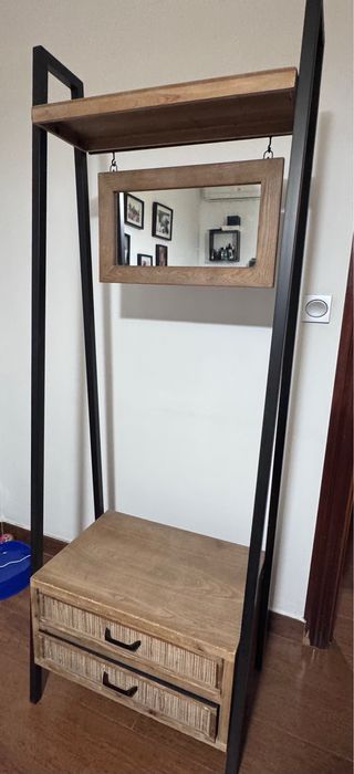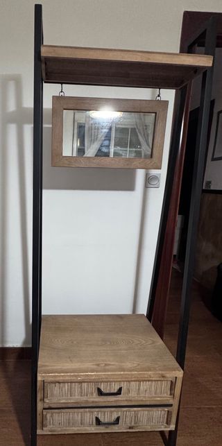 Mueble de entrada con espejo y detalles en madera. - Estructura principal de madera. - Espejo integrado. - Compartimentos abiertos para almacenamiento. Medidas aprox.: 60 cm de ancho x 1,97 m de alto.