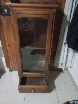 Mueble de madera con vitrina y cajón
