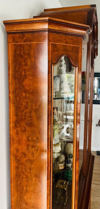 Elegante vitrina con detalles en raíz de nogal. - Estructura principal de madera. - Puertas y estantes de cristal. Alto 215cm, largo 143 cm y ancho 33 cm. Se vende vacío, la cristalería no se incluye en el precio.