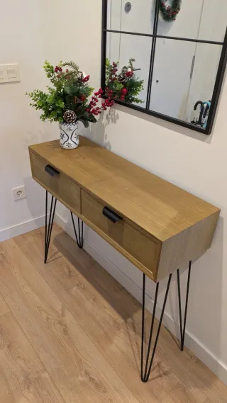 Consola de entrada con un diseño moderno y funcional. - Dos cajones con tiradores negros. - Patas de metal negro estilo horquilla. - Acabado en madera de tono cálido. Tiene un pequeño fallo en la madera, ver en la ultima foto. Ver sin compromiso