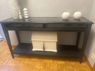 Elegante mueble consola con un diseño moderno y funcional. - Acabado en gris antracita. - Tapa superior de cristal. - Estructura de madera resistente. - Amplio espacio de almacenamiento.