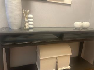 Elegante recibidor con un diseño moderno y sofisticado. - Encimera de cristal. - Patas gruesas con detalles dorados. Medidas: 120cm largo 82 cm alto 34,5 cm fondo No se hace envío