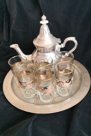 Antiguo Juego de té Marroquí comprado en Marruecos con más de 20 años sólo en exposición. Formado por tetera que tiene varios pequeños pelados ( ver fotos) y seis vasos de cristal con adornos en relieve y filos dorados, algunos irregulares. La bandeja de latón se añadió después comprada en Turquía. Nunca se han usado. Sólo en vitrina.