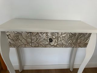Elegante mueble de entrada con un diseño clásico y ornamentado. Su acabado plateado le da un toque de distinción. - Estructura principal de madera.