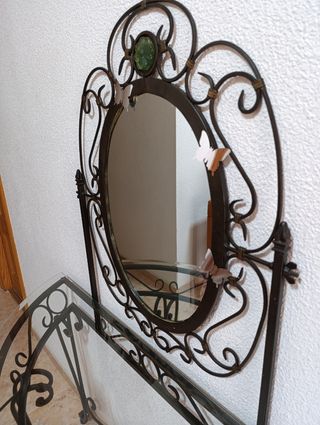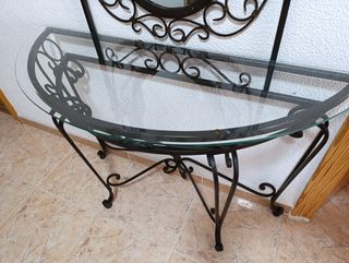 Preciosa entrada de hierro y forja con espejo y repisa de cristal,negro y en muy buen estado