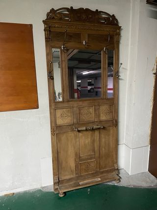 Antiguo aparador chapado en madera noble. Solo los espejos son nuevos. Madera tallada. Fabricado sobre el año 1900. Percheros fabricados en hierro. No se ha restaurado ni madera ni metal para que se mantenga como en su origen. Soberbia pieza de artesania de estilo sobrio, que se adapta a cualquier tipo de decoracion.
