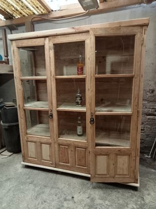 ANTIGUA VITRINA DE MUY BUENA MADERA DE PINO OREGON CON 2 PUERTAS LATERALES Y UNA FIJA EN EL CENTRO. CON SUS BALDAS Y TRASERA DE GRUESA MADERA MACIZA. CON SUS LLAVES Y FUNCIONANDO. LOS CRISTALES DEL FRENTE SON BISELADOS. FUE TOTALMENTE DECAPADA AHORA ESTA EN SU MADERA NATURAL. LUEGO SE PUEDE PINTAR SESUN SE DESEE. CON PÁTINA Y PEQUEÑAS SEÑALES PERO TOTALMENTE COMPLETA, MUY ESTABLE Y SEGURA. SE DESMONTA Y MONTA MUY FÁCILMENTE TODA PARA LLEVAR Y O COLOCAR Y MIDE EN TOTAL DE ALTA 210 CM X 186 CM DE ANCHA Y 56 CM DE FONDO. SE PUEDE ENVIAR DESMONTADA PERO MUY FACIL VOLVER A MONTAR