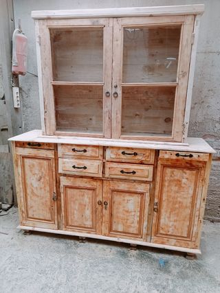 ANTIGUO MUEBLE APARADOR VITRINA DE BUENA MADERA AHORA AL NATURAL. LUEGO SE PUEDE PINTAR AL GUSTO. ANTES ESTABA DE BLANCO. CON 2 TABLAS AUXILIARES A LA DCHA E IZDA. PARA CORTAR U OTROS. CON TODAS LAS LLAVES DE LAS PUERTAS Y FUNCIONANDO.MIDE EN TOTAL ASI DE ALTO 215 CM X 186 CM DE LARGO Y 49 CM DE ANCHO O FONDO. SON 2 CUERPOS QUE SE PUEDEN VENDER POR SEPARADO Y EL CUERPO DE ABAJO MIDE DE LARGO 186 CM X 49 CM DE FONDO Y 107 CM DE ALTO Y EL DE ARRIBA MIDE DE ANCHO 139 CM X 40 CM DE FONDO Y 108 CM DE ALTO. SE PUEDE ENVIAR