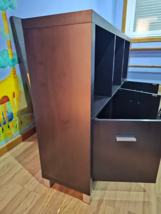 Conjunto de mueble de entrada con espejo. - Acabado en tonos beige y marrón. - Estructura principal de madera. - Espejo con marco de madera. Está completamente nuevo solo tiene un mes desde su montaje el precio en tienda 150€
