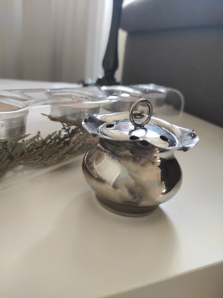 Siempre ha estado guardado en vitrina. Diseño en forma de flor. Está chapado en plata. Mide 5x6 cm. Está en perfecto estado.