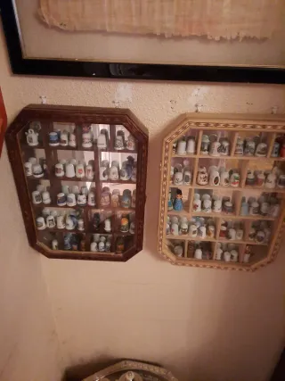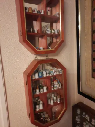 Elegante vitrina de madera con detalles dorados, ideal para exhibir tu colección de dedales. Sus superficies de cristal permiten una visión clara de cada pieza. - Diseño octogonal. - Múltiples estantes para organización. - Cierre con puerta.entre 30 y 20 cada vitrina
