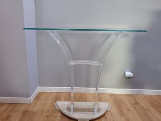 Elegante aparador con un diseño contemporáneo que combina materiales de alta calidad. - Base de piedra con acabado redondeado. - Estructura curva de acrílico transparente. - Encimera de cristal. - Diseño minimalista y sofisticado. se recoge en Rivas Vaciamadrid