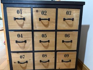 Mueble aparador de Maisons du monde. 9 cajones. - Estructura metálica negra. - Cajones de madera con números. - Tiradores negros. La parte de arriba tiene pequeñas marcas de uso. (Ver foto)