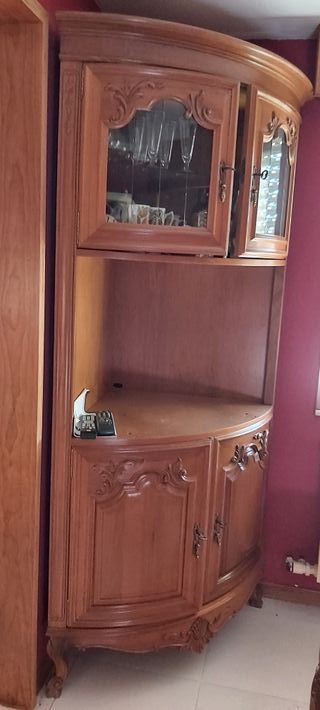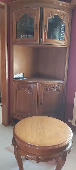 Conjunto en madera maciza de nogal tallado a mano. Consiste en mueble de esquina para bar, vitrina o aparador para loza, vajilla y menaje de hogar de 90 cms * 90 cms con hueco para TV + mesa centro baja de 80 cms diámetro + 2 mesas 1,10 mts + 1 mesa de centro baja de 80 cms * 40 cms. Ideal para casa de piedra, pazo o casa señorial. Estado impecable. Jose ... 696988487