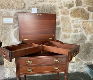 - Patas curvas. - Dos cajones con tiradores. - Borde decorado con pan de oro.