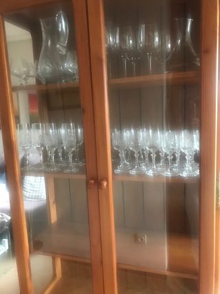 Preciosa vitrina de madera oscura con detalles dorados. Ideal para lucir piezas de cristal. Contiene un juego completo de cristal de Bohemia, incluyendo copas de vino, vasos y jarra. - Elegante diseño curvado. - Perfecto estado de conservación. - Un solo dueño.