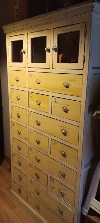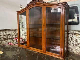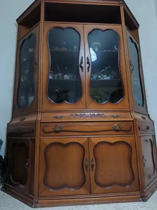 Mueble vitrina de estilo antiguo - Diseño de esquinas con compartimentos. - Puertas de cristal con detalles ornamentales. - Cajones y compartimentos inferiores. SOLO PARA RECOGER, NO ENVÍO. - Medidas: 2'15 alto 1'75 ancho 50 cm fondo