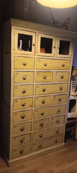 Mueble de diseño con múltiples cajones y vitrinas superiores. Ideal para almacenamiento y decoración. - Fabricado en madera. - Acabado en blanco y amarillo. - Costó 750€.