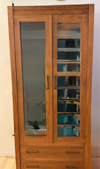 Mueble vitrina de madera con puertas de cristal, ideal para exhibir objetos. - Diseño clásico y elegante. - Amplio espacio de almacenamiento. - Acabado en madera natural. Diseño personalizado. Buen estado. Alto: 180 cms Ancho: 67 cms Profundidad: 42 cms