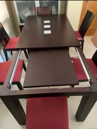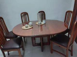 mesa redonda de madera y seis sillas a juego, además de una vitrina con botellero. - Mesa redonda de madera robusta elegante de color marrón - Seis sillas con asientos de piel. - Vitrina con botellero