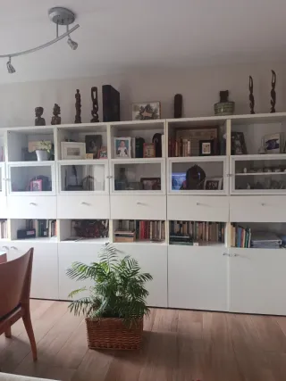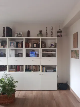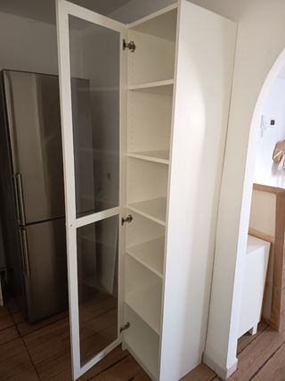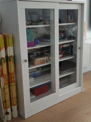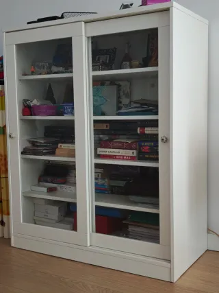 Elegante librería-vitrina de IKEA, perfecta para exhibir tus objetos favoritos. - Estructura de madera con puertas de cristal. - Diseño moderno y funcional. Tiene 5 baldas mobibles Dispongo de 2 unidades. Cada una por 99 € Si compras las dos, ajusto el precio