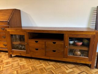 Mueble alargado de madera con puertas de cristal y cajones. - Diseño elegante y funcional. - Amplio espacio de almacenamiento. - Acabado en madera natural.