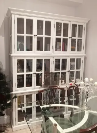 Vitrina de Ikea con puertas de cristal y estantes interiores. - Estructura blanca. - Puertas de cristal. - Estantes interiores.