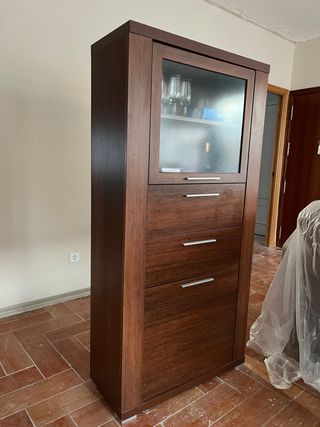 Mueble de madera con un diseño clásico y elegante, ideal para almacenar y exhibir objetos. - Amplio espacio de almacenamiento. - Puertas de cristal en la parte superior. - Cajones funcionales en la parte inferior. - Acabado en madera natural.