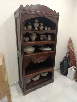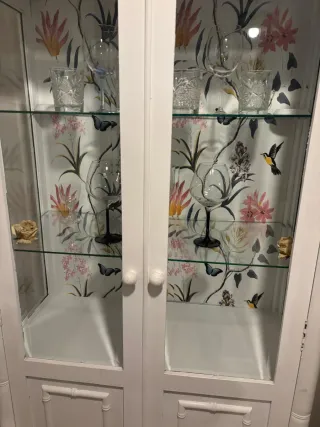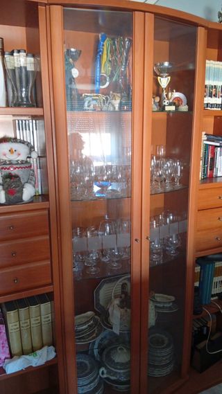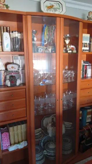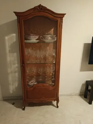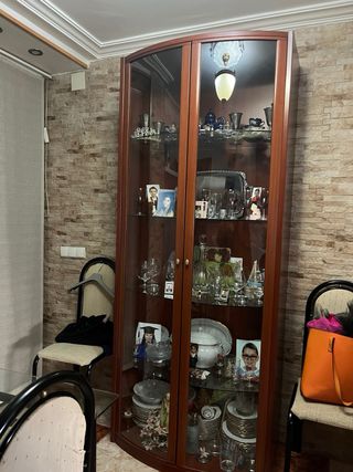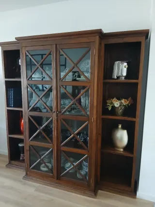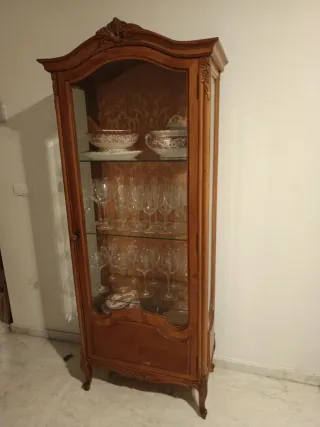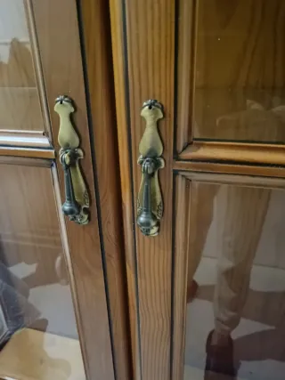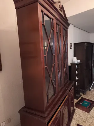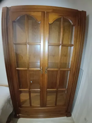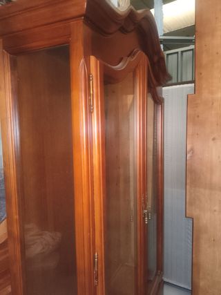 Elegante vitrina de madera con puertas acristaladas y baldas interiores.(conjunto con mueble de salón y recibidor, precio negociable) - Diseño clásico con detalles tallados. - Puertas con paneles de cristal. - Balda superior con forma curva.
