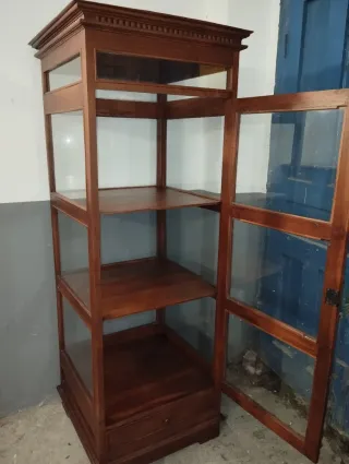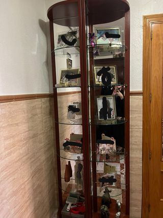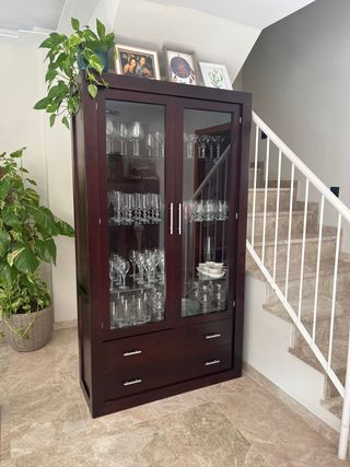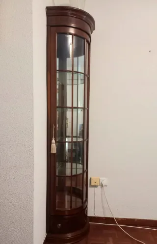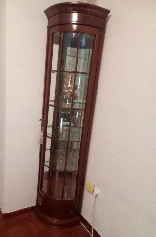 Se venden dos vitrinas esquineras en color caoba. Perfectas para aprovechar el espacio. Vitrina superior, cajón medio y puerta interior Cada una 90€ - Diseño elegante. - Puertas de cristal. - Tiradores dorados.