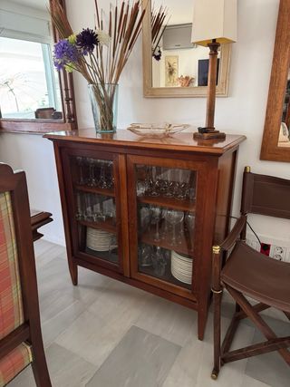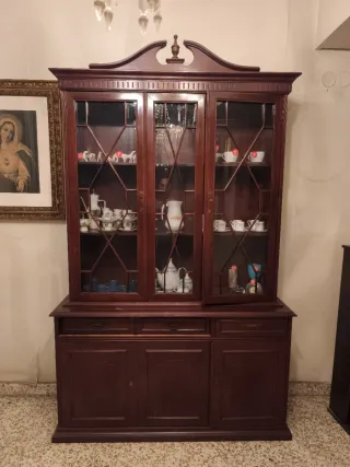 Elegante vitrina de madera con puertas de cristal. - Diseño clásico con detalles decorativos. - Amplio espacio de almacenamiento. - Ideal para exhibir vajilla o colecciones.